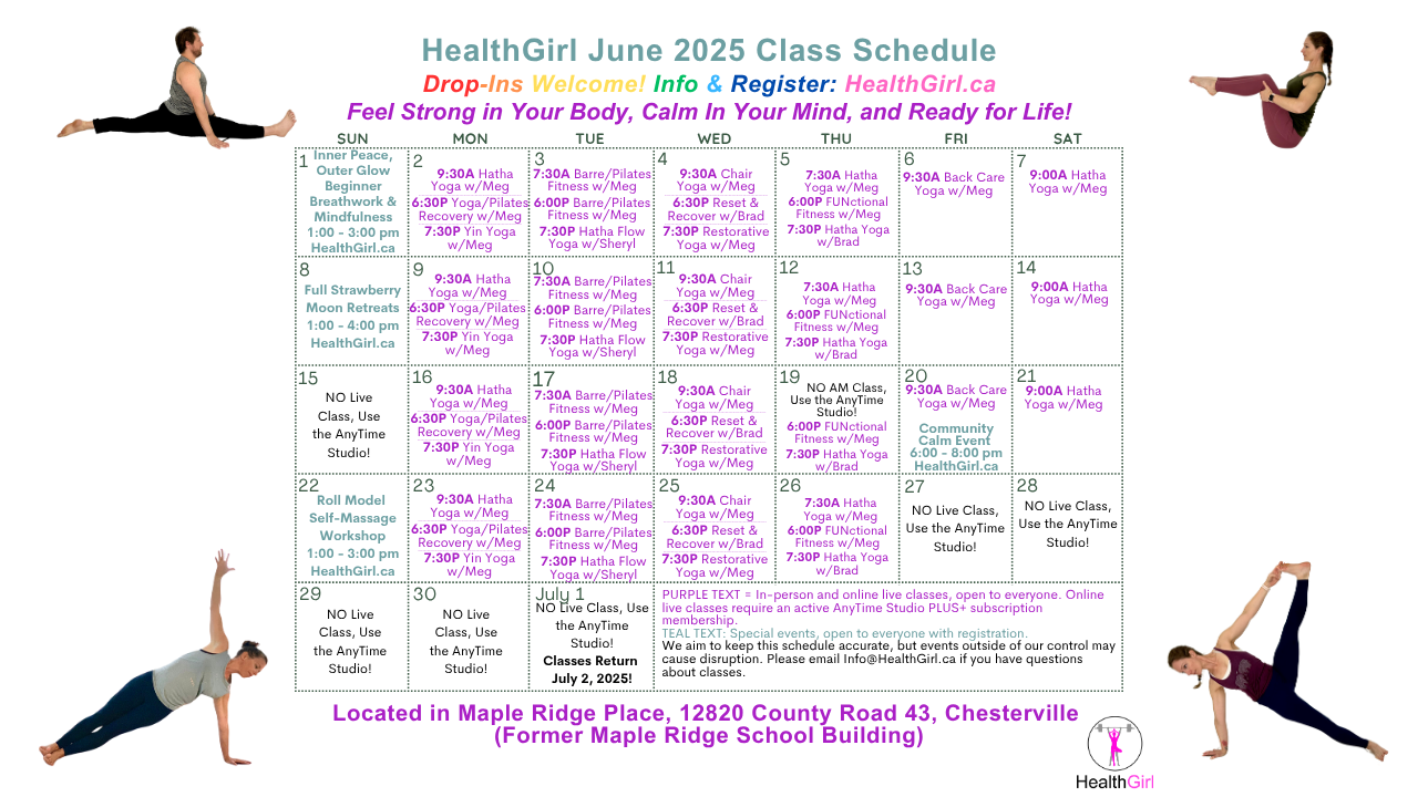 Our studio is located in Maple Ridge Place at 12820 County Road 43, Chesterville, Ontario. You can also join our AnyTime Studio membership to receive the classes in the comfort of your home.